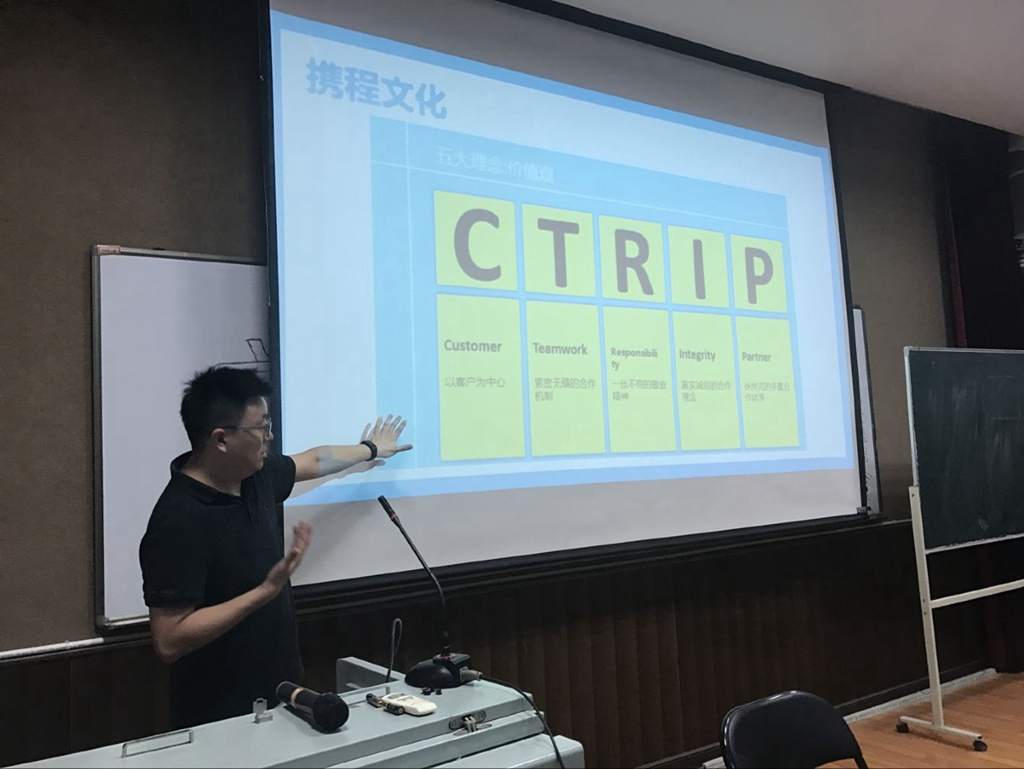 早晨九点,同学们在莫愁路校区集合。携程计算机技术(上海)有限公司南京分公司总经理易昆及人资部刘晓晨经理来到学校,为同学们开设了精彩的讲座。刘经理的精彩讲解让大家感受到携程“以丰富的服务内涵,高超的服务水准,永恒的服务承诺,携手成就精彩人生旅程”的企业使命感。同学们也了解到旅游管理专业的学生未来工作的岗位不仅仅局限于旅行社里的导游,在互联网旅游势头迅猛发展的形势下,旅游业的新兴岗位越来越多。新时代,“慧”旅游,这也给我们的学生提出了更高的要求,必须要更加努力地学习,积极实践,才能紧紧跟上时代的脚步。讲座中刘经理还与学生积极互动。同学们大胆地提问,刘经理耐心地为大家解答,现场气氛活跃。