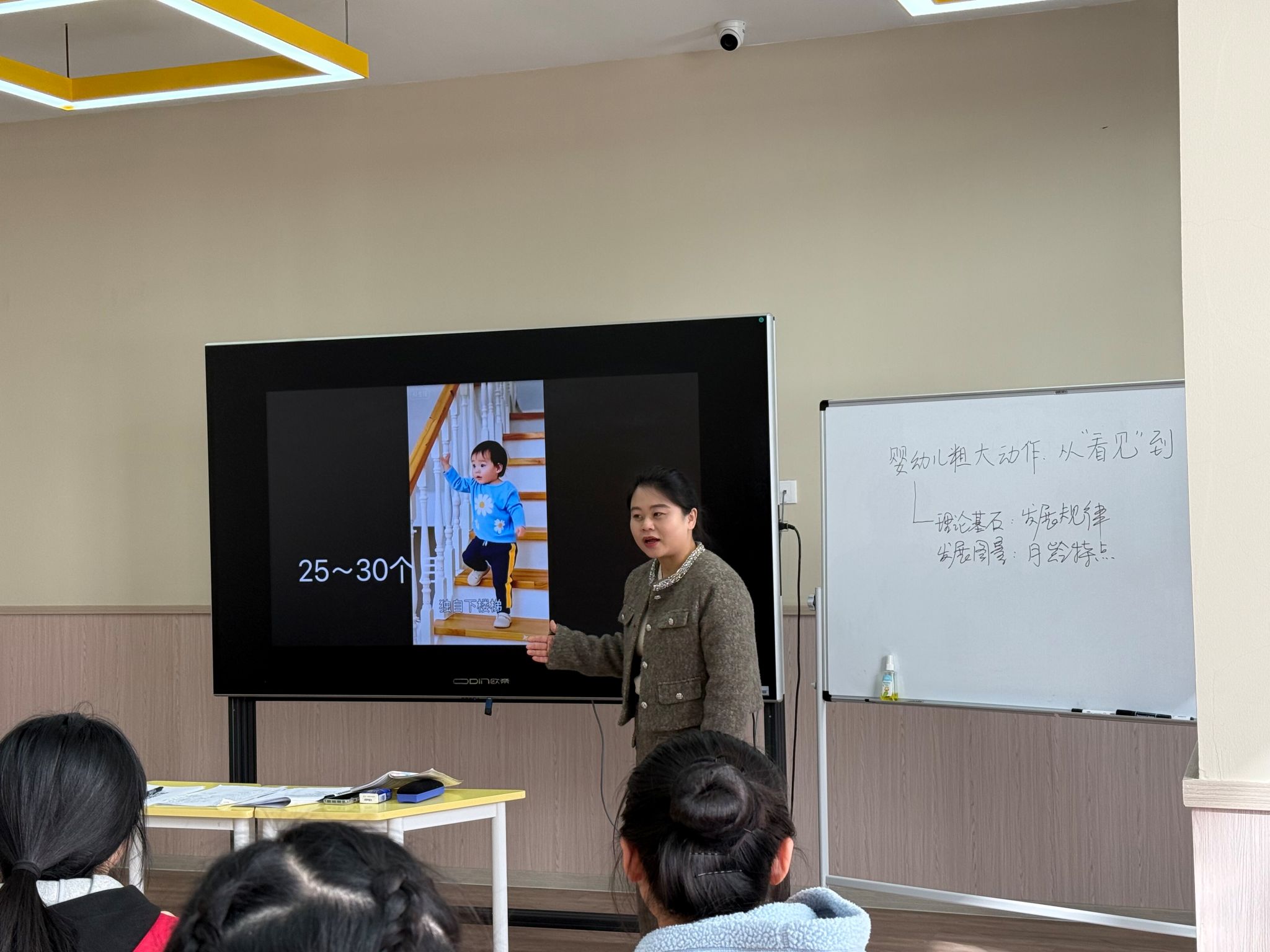 活动以张文静老师《婴幼儿粗大动作发展的观察与记录》公开课拉开帷幕,课程紧扣“观察-记录-分析-支持”的专业闭环,以“从‘看见’到‘支持’”为主线,系统讲解了0-36月龄婴幼儿粗大动作的发展规律与观察方法。教学中创新融合了多媒体课件、学生自制AI视频案例、真实婴幼儿视频及AI智能体互动等多种资源,采用任务驱动、情境模拟、小组探究等多元化教学方法,课堂生动而富有实效。